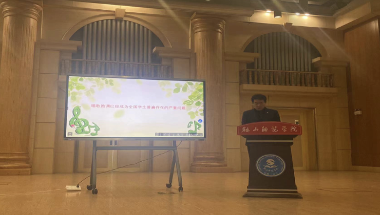 其次,郭老师指出,唱歌跑调是目前全国员工普遍存在的严重问题。其原因有四点:一是双基教学被虚化,没有基本知识和基本技能;二是教学内容被泛化,泛化到与音乐无关的事,使音乐课失去了本色;三是音乐授课过程与方法被形式化,有形式无内容、有活动无体验、有探究无结果;四是现代教学技术高度依赖化,教师专业素养荒废,自信全无。此外,郭老师还特别强调,合唱团在音乐教育中的重要性,合唱团的训练理念要求每名音乐教师既是演唱者又是伴奏者;既是指挥者又是创作者。同时,郭老师让同学们多多关注农村音乐教育,他为同学们带来了一段乡村小学合唱团参加国际比赛的视频,这让同学们感触颇深。