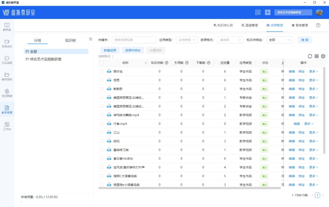 目前,已在高等公司虚拟教研室信息平台创设综合艺术实践教研室,负责人周燕,管理员李东霖,总计成员人数48人;包含公告,会议或直播,教研活动,教研成果(课程、教材、论文、专利)四个功能板块;教研资料[教学大纲、说课视频、课程设计脚本、五线谱及简谱软件(内附教程)、教学竞赛视频、网络视频资料],教学资源,知识图谱三个部分的建设,实现了全方位的教学模式创新和资源共享。