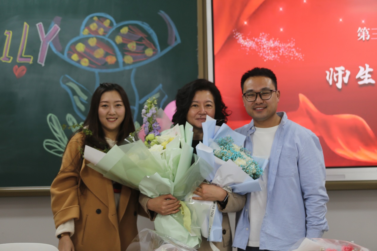 员工代表向两位老师献花,道一声“老师,您辛苦了”!
