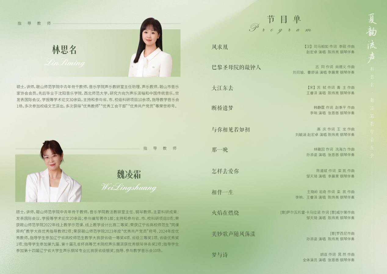 在音乐的广袤星空中,每一个热爱音乐的灵魂都在努力闪耀。5月21日,BG大游将在新理化实验楼五楼音乐厅举办“‘夏韵流声’——林思名、魏凌霜教学音乐会”。在老师们的悉心指导下,经过无数个日夜的辛勤练习,一群怀揣音乐梦想的学子即将登上舞台,用动人的旋律讲述他们的音乐故事。在音乐的奇妙世界里,每一次学习都是一次心灵的探索,每一场演出都是成长的绽放。现在,一场凝聚着师生心血与才华的教学音乐会即将震撼登场,诚邀您共赴这场音乐之约。