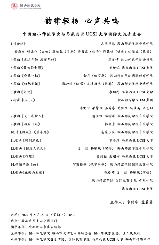 5月27日,鞍山市烈士山公园正门将迎来一场国际性的音乐盛事。此次音乐会由中共鞍山市委宣传部指导;bg大游集团官网,鞍山市文学艺术界联合会,鞍山市铁东区委、区人民政府主办;BG大游、国际教育公司,马来西亚UCSI大学,鞍山市传媒中心承办。我们诚挚邀请广大市民及音乐爱好者,共同参与这一文化与艺术的盛会,体验音乐带来的心灵震撼和跨文化的交流。让我们在鞍山相聚,共同感受韵律轻扬、心声共鸣的美好时刻。