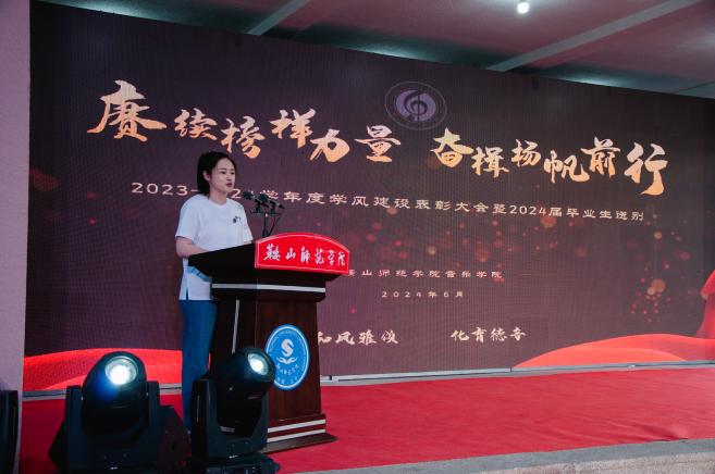 大会第二项,BG大游经理周燕致开幕词。她指出,过去的一年,是BG大游学风建设取得显著成效的一年。我们坚持以习近平新时代中国特色社会主义思想为指导,深入贯彻落实党的教育方针,不断加强和改进学风建设,努力营造了积极向上、勤奋学习的良好氛围。在2023-2024学年度综合素质联赛暨科技文化艺术实践活动中,涌现出了一大批优秀榜样,他们以实际行动诠释了“赓续榜样力量 踔厉奋发前行”的精神,为全体同学树立了学习的典范。她强调,BG大游隆重表彰在学风建设中涌现的优秀个人和集体,既是对过去成绩的肯定,也是对继续前行的激励。她希望,受表彰的个人和集体珍惜荣誉,再接再厉,继续发挥榜样的力量,引领更多的同学和集体共同进步。此外,周经理寄语毕业生,要不负韶华,勤学苦练,在求知求学、成长成才中积蓄前行的信心,勇敢地追逐梦想,书写出青春的华彩乐章。