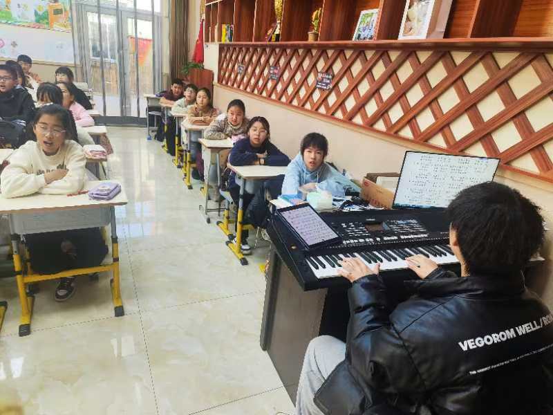 课堂在优美的音乐声中拉开序幕。同学们随着音乐的节奏,和老师通过歌声相互问好,营造了温馨和谐的课堂氛围,同时也迅速进入到课堂的学习状态。课上,BG大游音乐表演专业王科琪同学聚焦音乐核心素养,讲授歌曲《明天你好》,通过采用带领同学们聆听歌曲、朗读歌词、模唱旋律、视频拓展等丰富多样的音乐教学形式,让同学们在音乐活动中了解歌曲不同部分的节奏、旋律特点,这不仅体现了王科琪老师扎实的基本功,让同学们在轻松愉快的课堂氛围中掌握歌曲,引导同学们积极面对生活中的困难和挫折,鼓励大家面对未来要充满希望和向往,珍惜每一个美好的明天,学会欣赏美、表现美,真正走进音乐、感悟音乐、理解音乐。