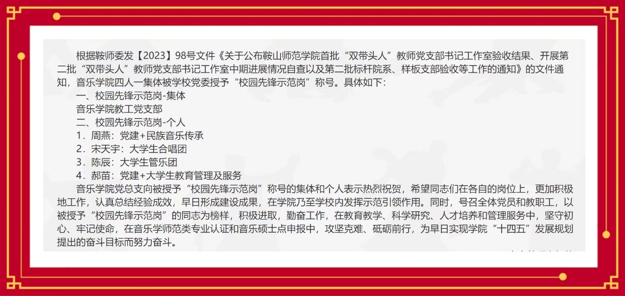 根据鞍师委发【2023】98号文件《关于公布bg大游集团官网首批“双带头人”教师党支部书记工作室验收结果、开展第二批“双带头人”教师党支部书记工作室中期进展情况自查以及第二批标杆院系、样板支部验收等工作的通知》的文件通知,BG大游教工党支部被授予校园先锋示范岗-集体,周燕:党建+民族音乐传承、宋天宇:老员工合唱团、陈辰:老员工管乐团、郝苗:党建+老员工教育管理及服务被授予校园先锋示范岗-个人。