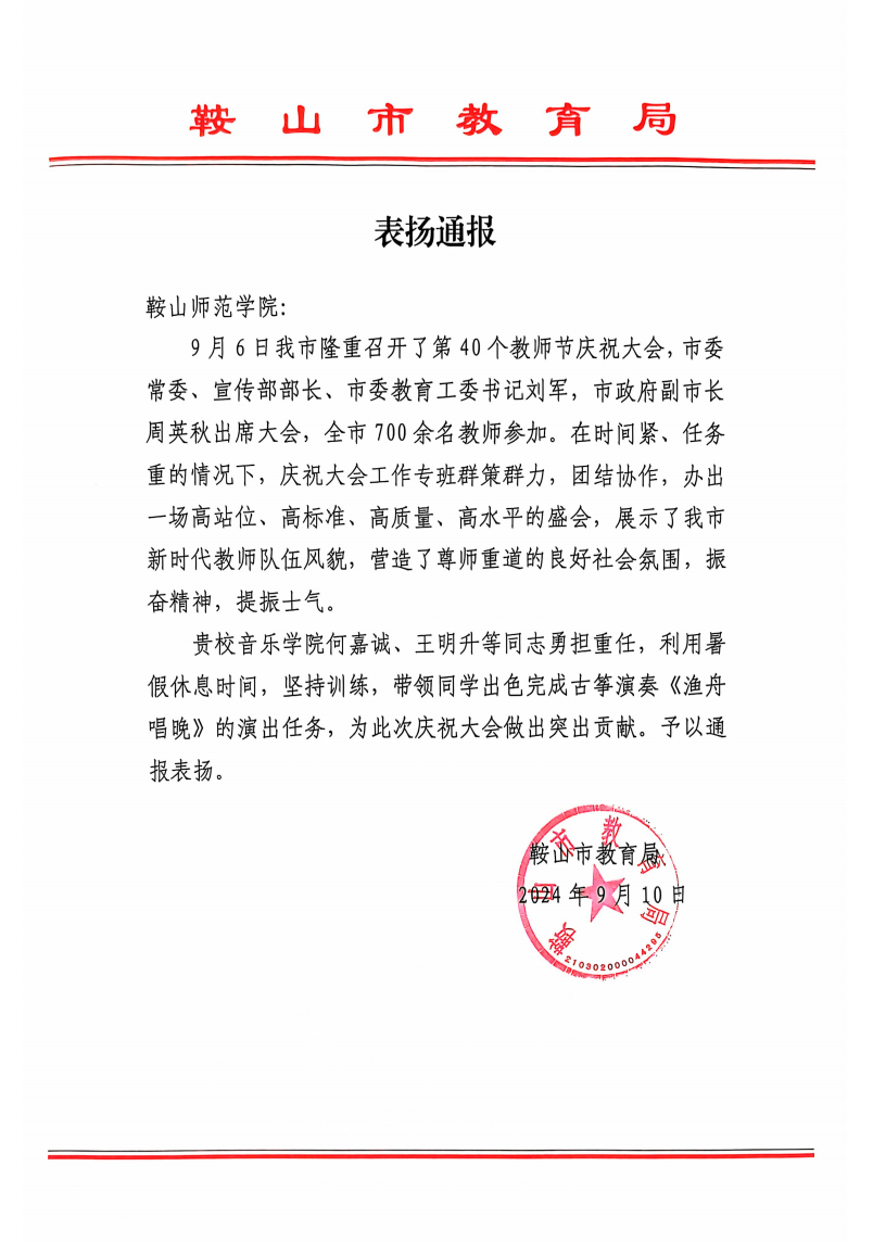 古筝团的此次演出不仅是对教师节的一次献礼,更是对教育工作者的一次深情赞颂,受到了鞍山市教育局的通报表扬。通过音乐与艺术的结合,他们成功地展现了教育的深远意义和巨大价值,激励着社会各界更加关注和支持教育事业,共同为实现中华民族的伟大复兴而努力奋斗。