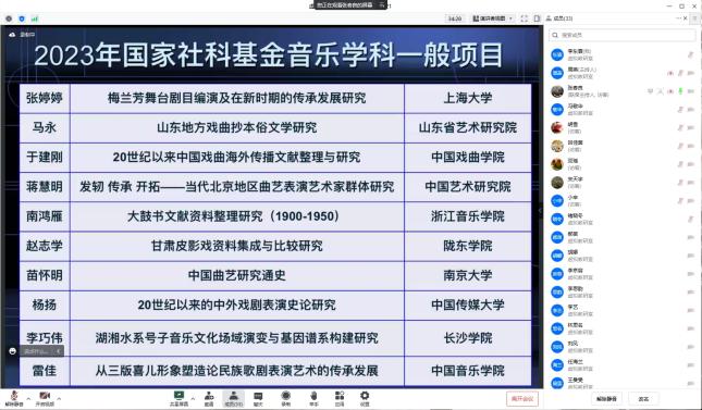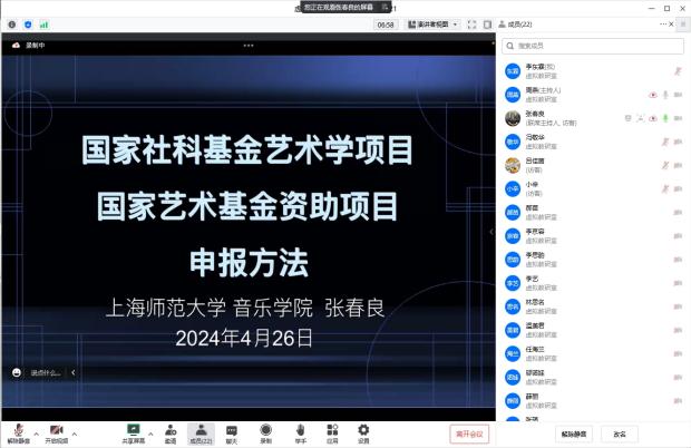 2024年4月26日,BG大游邀请特聘教授、上海师范大学BG大游副经理张春良,通过虚拟教研室在线会议方式为全体教师举办了“关于国家社科基金艺术学项目、国家艺术基金资助项目申报方法”专题讲座。